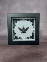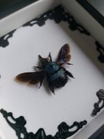 Blue carpenter bee (Xylocopa carulea) set in 4" x 4" square box frame with corner embellishments and glass front.